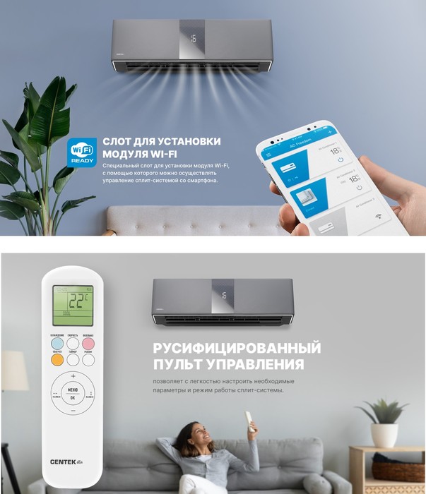 Современная и очень стильная модель настенного кондиционера Centek (Центек) CT-65G10 (Gray) представлена в оригинальном сером цвете с качественной матовой поверхностью внутреннего блока. Это идеальный вариант для тех, кто ищет экономичное устройство для кондиционирования комнаты площадью 30 квадратных метров.