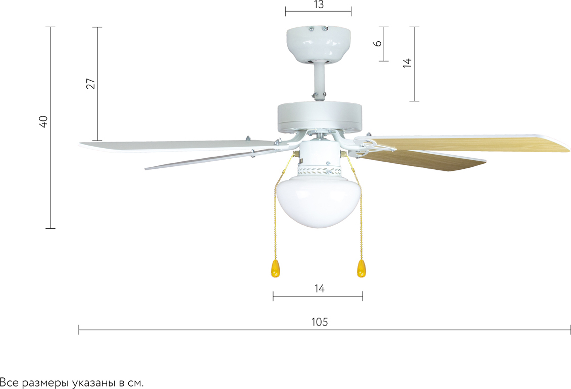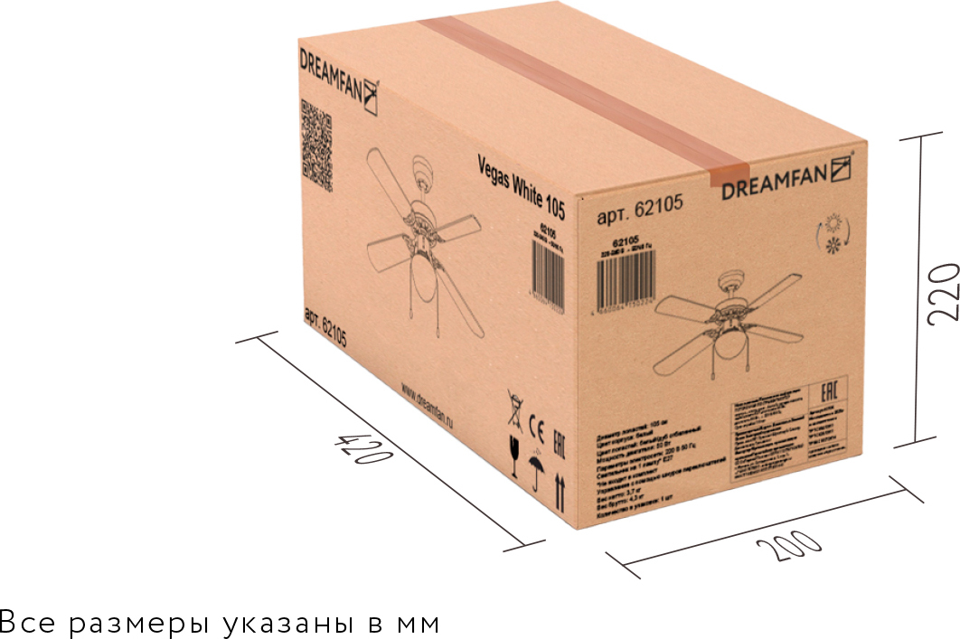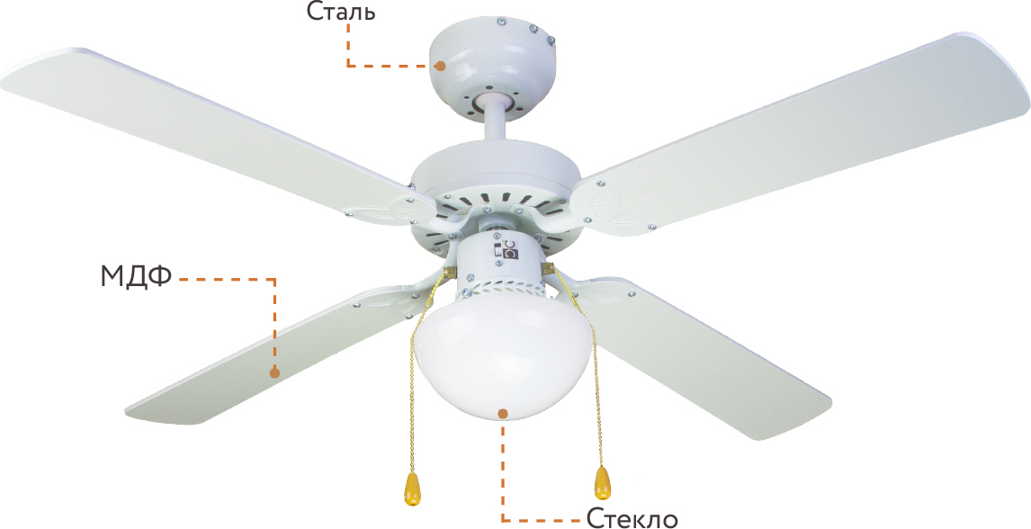 Люстра-вентилятор Dreamfan (Дримфэн) Vegas White 105 - современный комбинированный прибор, который способен совмещать функции двух важных для комфортного быта устройств. Два шнура-переключателя: один предназначен для переключения скорости вращения двигателя, второй - для включения или выключения лампы, способной работать независимо от мотора.