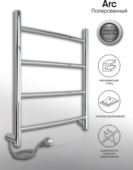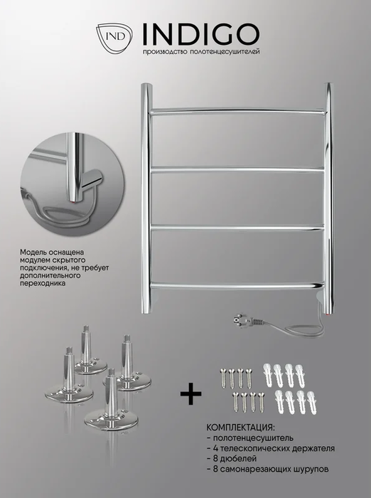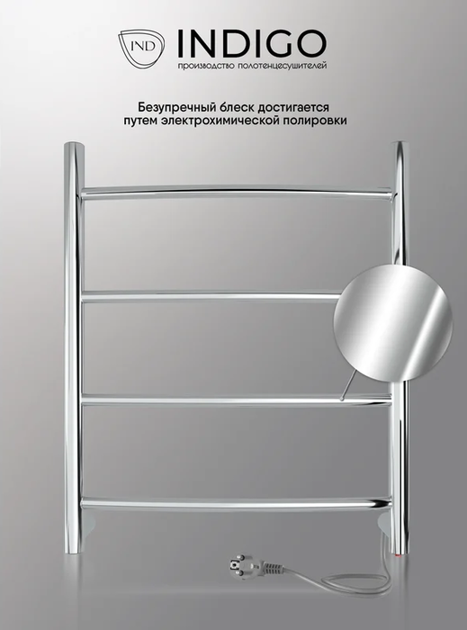 INDIGO (Индиго) Arc б/п (el) 50/40 Полиров. – это элегантный и компактный полотенцесушитель лесенка, выполненный из нержавеющей стали. Благодаря проложенному внутри секций кабелю поверхность полотенцесушителя нагревается до безопасной температуры +50 градусов. Полированное покрытие делает модель стильным украшением интерьера.
