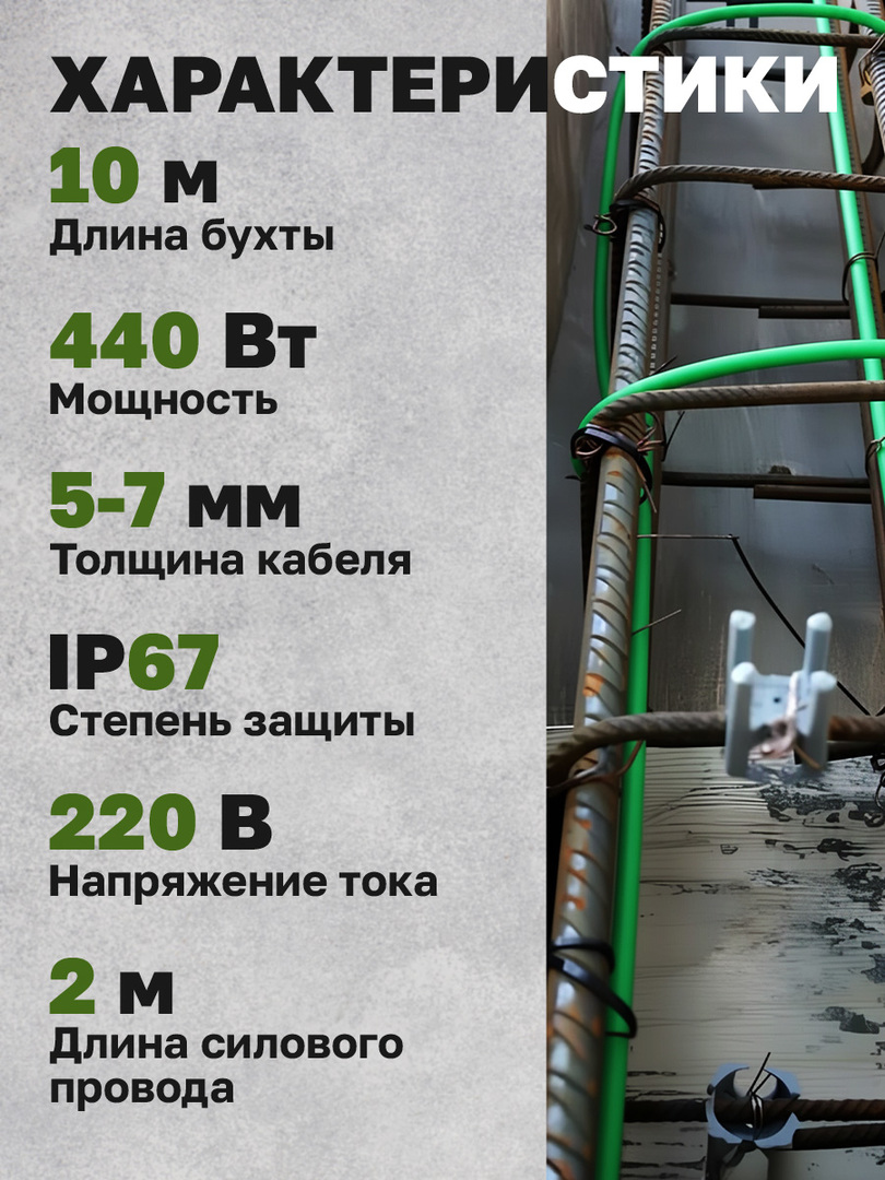Мощность кабеля Vetona (Ветона) КБ 40-10 обеспечивает равномерный нагрев по всей протяженности участка установки, с диапазоном рабочих температур от -30 до +70 градусов Цельсия. Это позволяет конструкции обеспечивать быстрое и равномерное затвердевание бетона даже в условиях сурового климата.