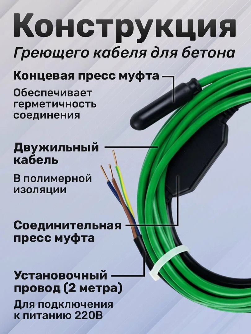 Двухжильный греющий кабель 40 Вт/м для зимнего бетонирования Vetona (Ветона) КБ 40-78 – это высокотехнологичное решение для поддержания необходимого температурного режима при застывании бетона в холодный период. В качестве материала для внешней оболочки кабеля используется поливинилхлоридный пластикат.