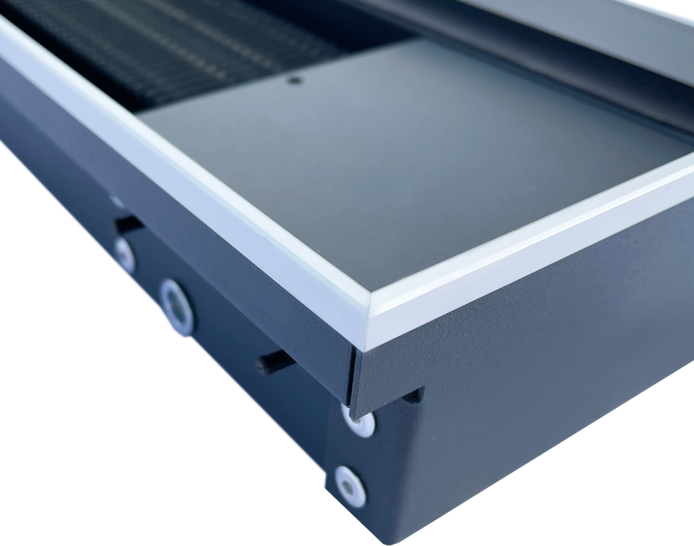 Конвектор внутрипольный от Techno (Текно) Power KVZ 300-85-1000 оснащен эффективным теплообменником из медной трубки с оребрением из алюминия. Дополнительные ребра жесткости внутри стального корпуса обеспечивают повышенную надежность и предотвращают деформацию конструкции. Порошковое покрытие также повышает устойчивость к окислению.